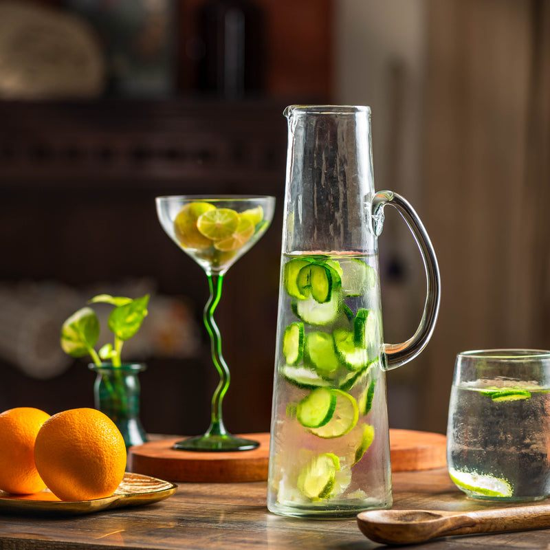This elegant hammered glass pitcher offers a refreshing take on tabletop presentation. Crafted from clear, high-quality glass with a subtle hammered texture, it adds a sparkle to any setting. The pitcher features a sleek, cylindrical design, a convenient spout for easy pouring, and a sturdy handle for a comfortable grip. It comes with a generous capacity, perfect for serving infused waters, iced teas, or cocktails. Pair with our hammered stemless goblets for the perfect look!