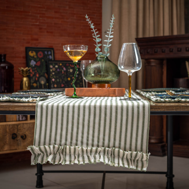 The Sage Table Runner is all about easy style and everyday use! Offering a classic touch with its elegant striped design and soft ruffled edges, this runner is both functional and stylish. Easy care ensures it stays looking great meal after meal. Pair with our matching Sage placemats for a beautiful table setting!