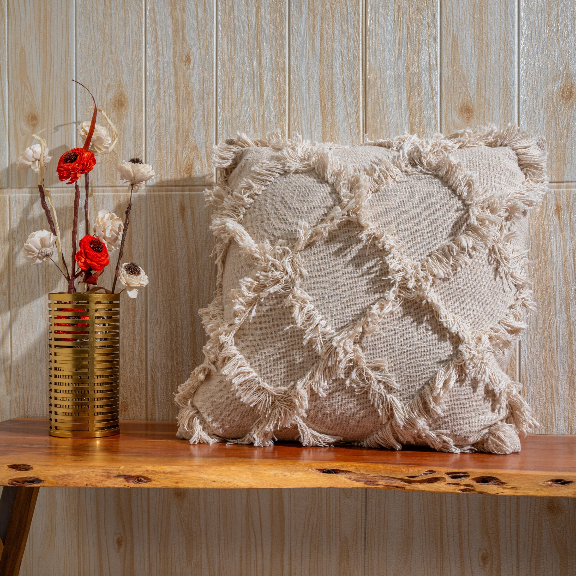 The Diamond Fringe Cushion is a textural delight, designed to infuse your space with personality and style. This charming cushion is accented by playful fringes for a contemporary yet bohemian aesthetic. Neutral in color, it pairs seamlessly with various decor styles while inviting touch with its soft, inviting fabric. Perfect for layering or as a stand-alone statement piece.
